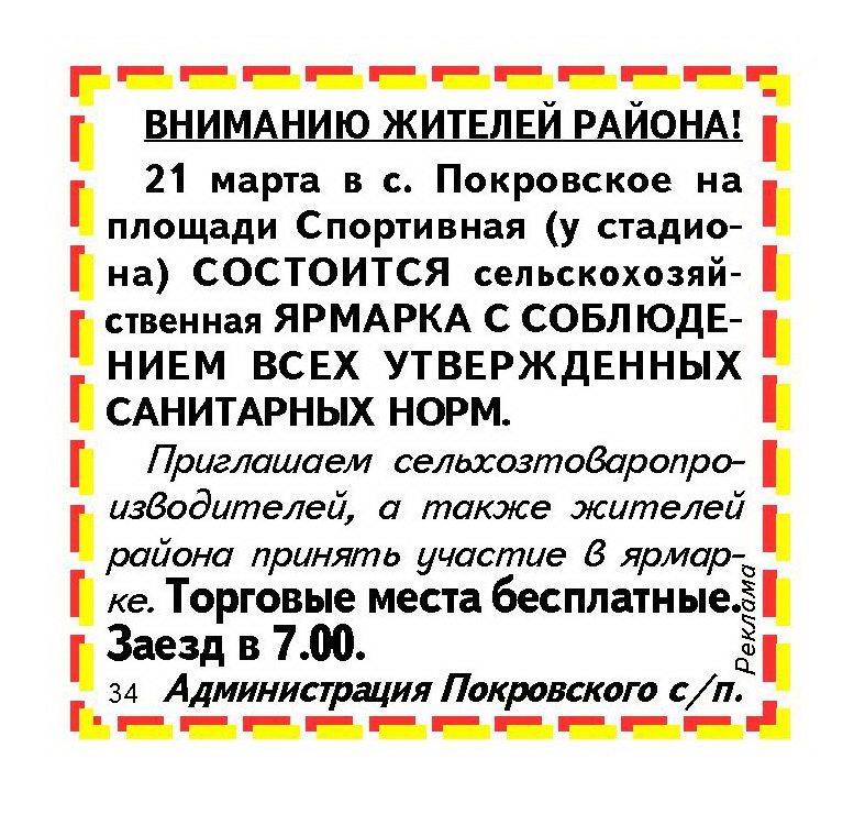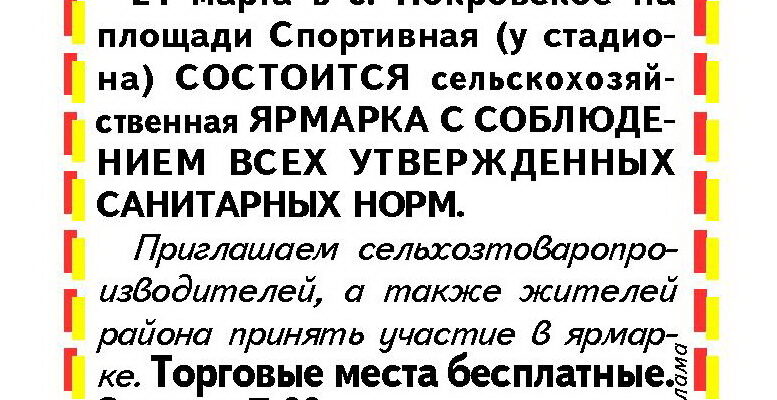 21 марта на площади Спортивной у стадиона, в центре с. Покровское вновь состоится сельскохозяйственная ярмарка. Об этом информирует администрация Покровского поселения.