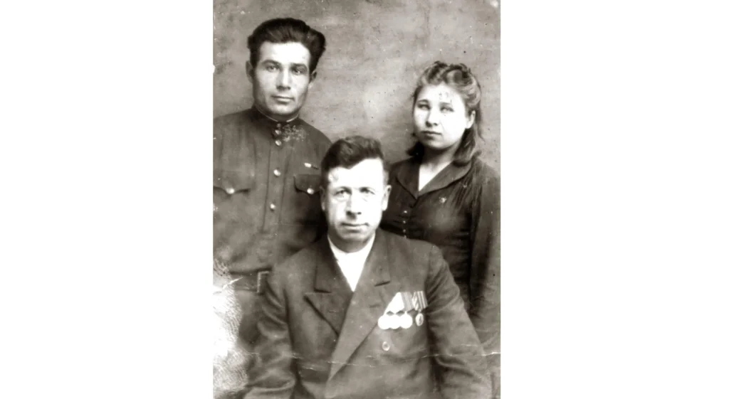 На снимке: мои родители и дедушка Павел Абрамович Попов, 1947 г.