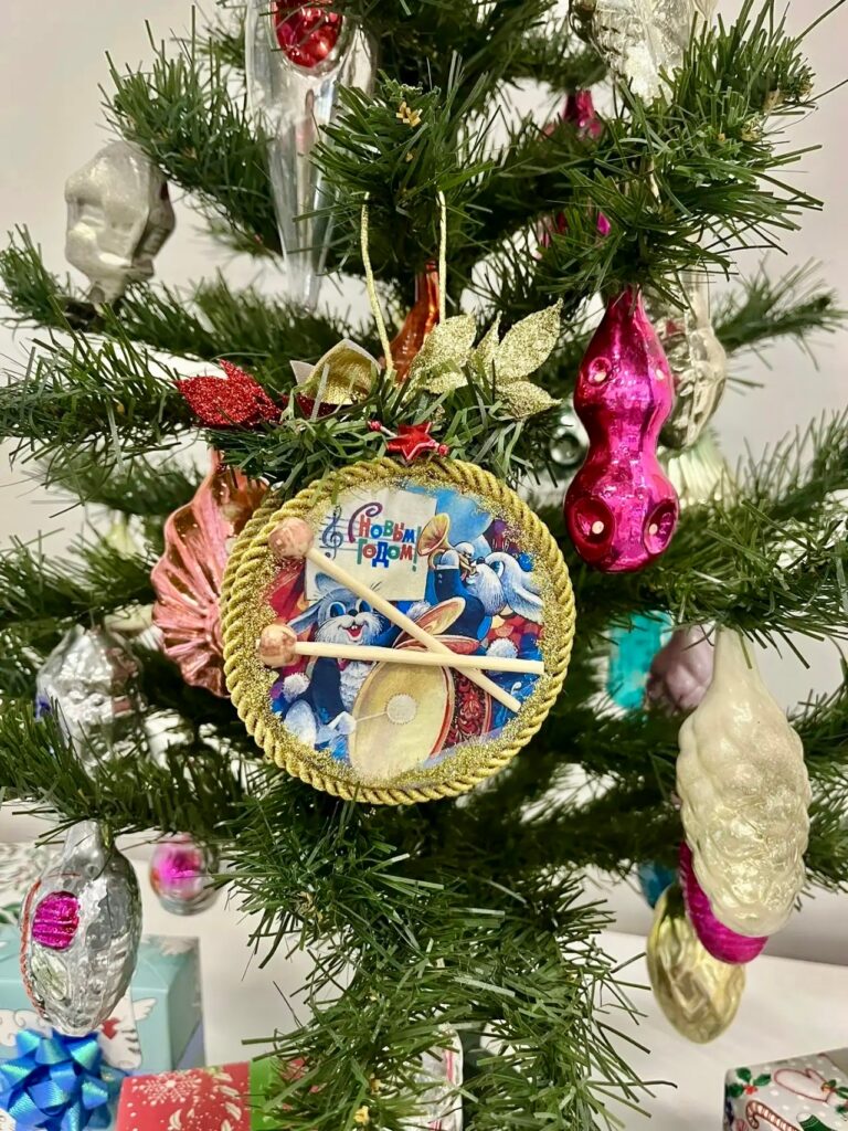 В музее уже прошёл мастер-класс, на котором ребята мастерили ёлочную игрушку «Новогодний барабан».