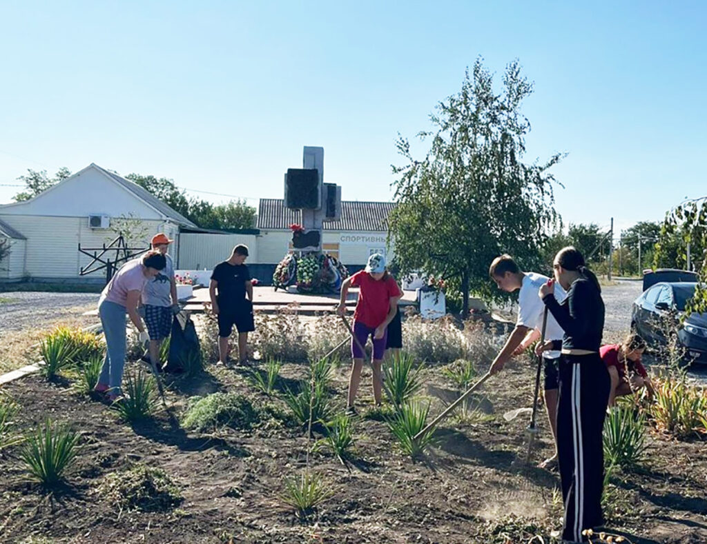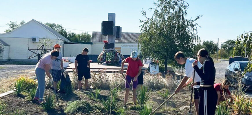 Сотрудники библиотеки и волонтеры провели экологический субботник по приведению в порядок обелиска в центре села.
