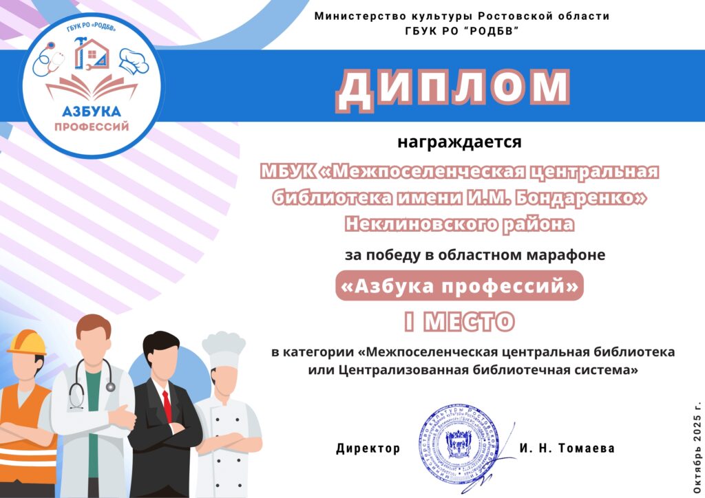 «Межпоселенческая центральная библиотека имени И.М. Бондаренко» Неклиновского района стала победителем областного марафона летнего чтения 2025 года «Азбука профессий».