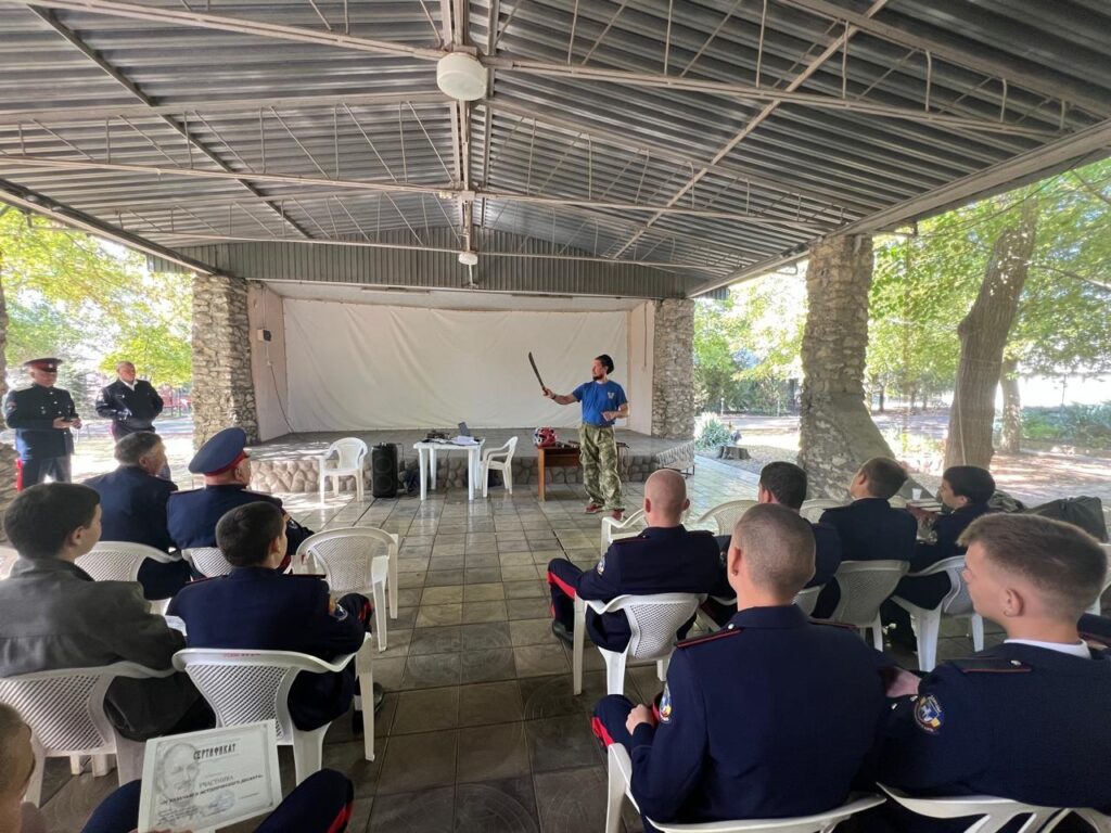 Мастер-класс по казачьим единоборствам провели атаман городского казачьего общества «Азовское» ОКО РО ВКО «ВВД» Ю.В. Рыбченко и его заместитель Т.В. Рыбченко.