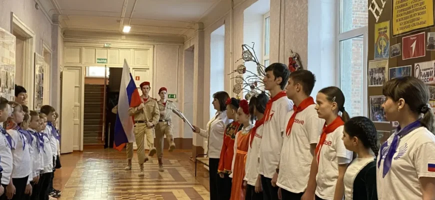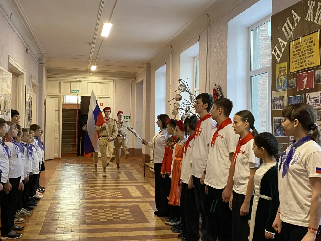 Знаменная группа юнармейцев школы торжественно вынесла Государственный флаг России. Прозвучал гимн страны, напоминая о нашей общей истории. Мероприятие было подготовлено и проведено советником директора по воспитанию В. Ю. Подакиной и председателем первичного отделения «Движения первых» Н. Лифаревой.