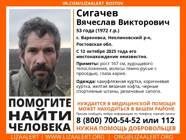 Пропал Сигачев Вячеслав Викторович, 53 года, житель с. Вареновка Неклиновского района. Об этом сообщает поисковый отряд «ЛизаАлерт».