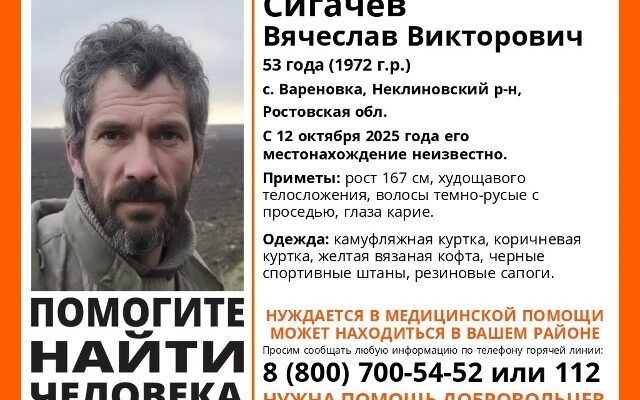Пропал Сигачев Вячеслав Викторович, 53 года, житель с. Вареновка Неклиновского района. Об этом сообщает поисковый отряд «ЛизаАлерт».