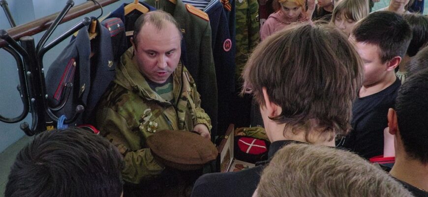После окончания концертной программы Сергей Геннадьевич рассказывал ребятам о казачьем оружии и одежде (справе) казаков, традициях воспитания детей (мальчиков и девочек) в казачьих семьях.